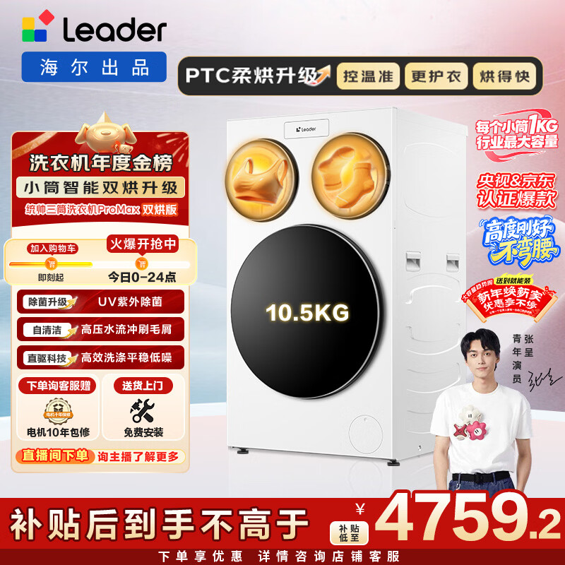 统帅(Leader)海尔出品懒人三筒洗衣机ProMax双烘全自动 PTC烘干 国家补贴 三桶 12.5公斤XQ ...