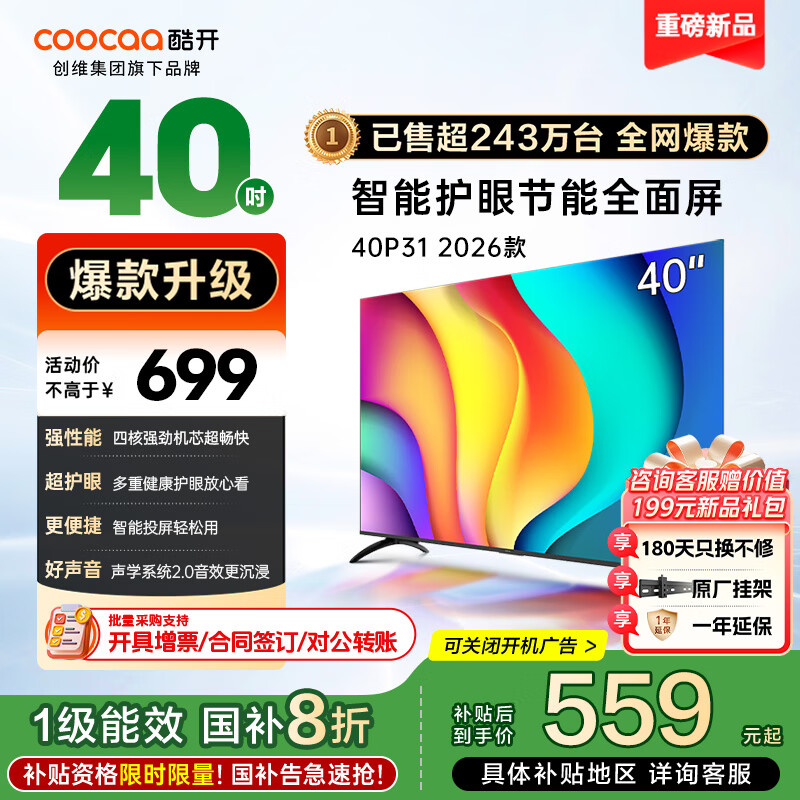 酷开(coocaa)创维电视P31 26款 40英寸电视全高清超薄全面屏 护眼防蓝光智能液晶电视机以旧换新 40P3F 40英寸