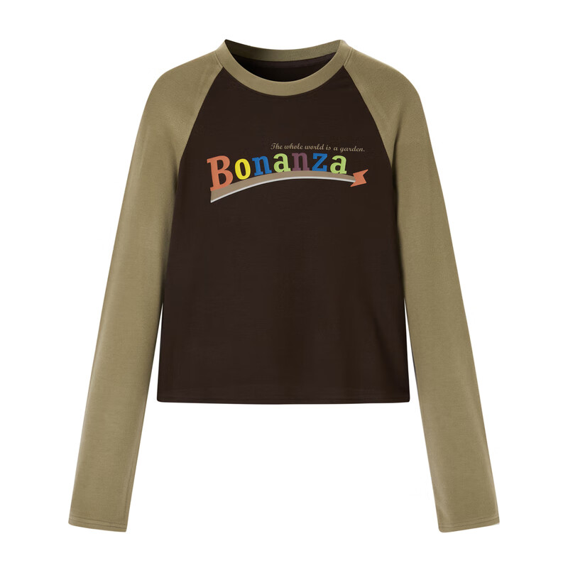乐町拼色印花上衣长袖T恤女插肩撞色紧身T恤女C2CPD4120 咖啡色 S