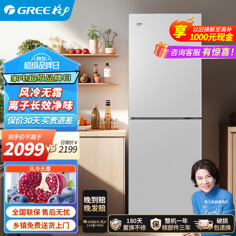 格力晶弘两门冰箱 228L 风冷无霜 离子长效抗菌净味 纤薄机身 精确电脑控温 BCD-228WEC/典雅银