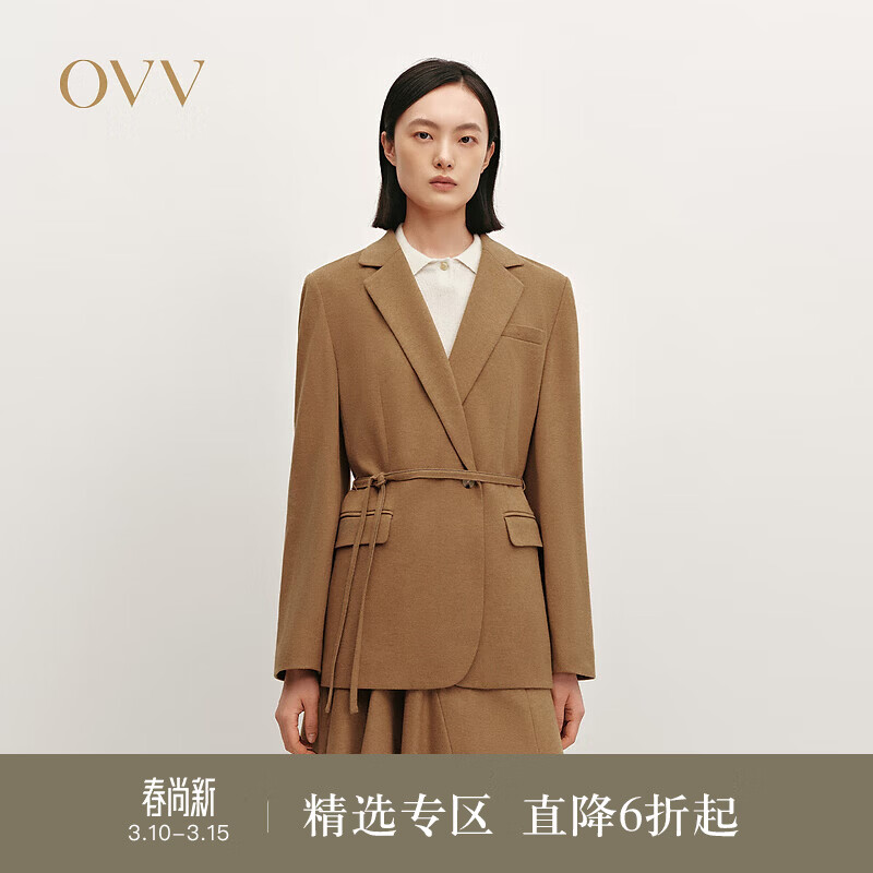 OVV秋冬热卖女装平驳领针织羊毛随附腰带休闲西服外套 焦糖棕 M